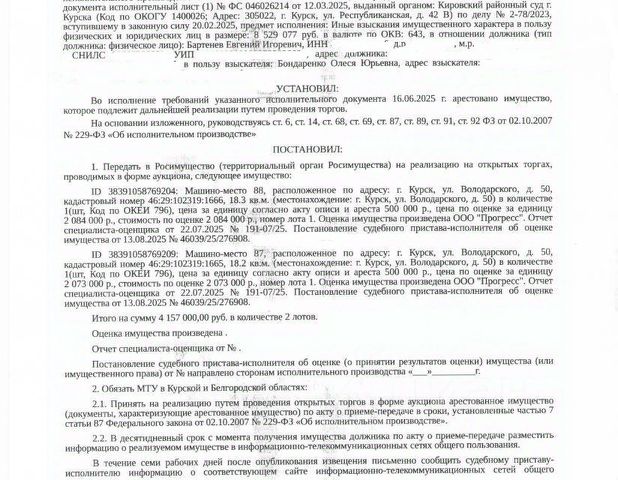 Данные получены с сайта ГИС Торги. Машино - место площадью 18,2 кв. м, кадастровый номер 46:29:102319:1665, подземный этаж, подвал на отм. - 3.900 (имущество обременено: арест, запрет на совершение регистрационных действий). Имущество принадлежит на праве собственности должнику Бартеневу Е.И. Взыскатель Бондаренко О.Ю. Основание проведения аукциона: постановление о передаче арестованного имущества на торги от 04.09.2025 46039/25/307910 ведущего судебного пристава ОСП по Железнодорожному округу г. Курска