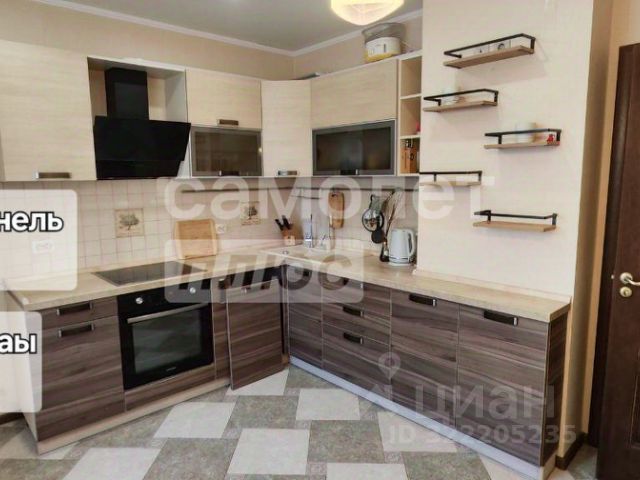 КУХНЯ: 9,0 м2, встроенная угловая кухня TORCHETTI (Италия, дерево-бук) со встроенной двухкамерной мойкой, большой обеденный стол и бытовой техникой ARISТON: холодильник, морозильная камера, варочная электропанель (4-х конфорочная), духовка, вытяжка. Стиральная машина Индезит (Россия). Металлические жалюзи на окне.