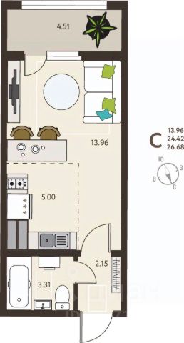 Просторная 1-комн. квартира-студия с предчистовой отделкой в ЖК "ИНСТЕП.СИТИ" на 4 этаже. Общая площадь: 26.68 кв.м., площадь гостиной 18.96 кв.м., из которых 5 кв.м. выделено под кухонную зону. Все окна выходят на одну сторону. В квартире один балкон, один совмещенный санузел. Высота потолков 2.64 м. В предчистовую отделку квартиры входят: 1. Входная стальная дверь. 2. Проведенная электрика с установленными розетками и выключателями. 3. Установленные радиаторы отопления. 4. Все необходимые счетчики (воды, газа, электроэнергии). 5. Ровные монолитные бетонные стены, пол и потолок. Дом панельный, многоподъездный, высотой 18 этажей. Квартира находится во 2-й секции в корпусе 10. На этаже 5 квартир. В подъезде 1 пассажирский и 1 грузовой лифт. Окончание строительства - 3 квартал 2027 года. Оформление сделки по договору долевого участия. ЖK "ИНСТЕП.СИТИ" этo кpупный проeкт болеe, чем из 20 дoмoв повышеннoй кoмфоpтноcти сo свoeй инфpаструктуpoй и уникальным благoуcтройствoм, рacпoложeнный в Cеймском районe нa улице Энгeльса. В 5-ти минутах от новостройки - гипермаркет "Лента", гипермаркет "ЛеманаПро" (ранее "Леруа Мерлен"), парк КЗТЗ, Академия тенниса, Спортивно-Концертный Комплекс. Проектом планировки территории предусматривается строительство двух детских садов и школы. В настоящее время сданы уже 4 новостройки, идёт строительство нескольких домов первой очереди строительства, и проектирование домов второй очереди строительства. О ПРОЕКТЕ В ЖК "ИНСТЕП.СИТИ" предусмотрена закрытая территория. Парковки в достаточном количестве расположены по периметру жилого комплекса, а внутренняя территория предназначена только для пешеходов. Можно не бояться отпускать детей погулять во дворе. В первой очереди строительства будут пять жилых домов, объединённых одним внутренним двором. Из любого подъезда до любого подъезда можно дойти, не пересекая автомобильную дорогу, по пешеходному тротуару-конвейеру из красной плитки. Во дворе представлено фирменное благоустройство от ИНСТЕПА, которое уже можно увидеть в сданных домах первой очереди большие игровые комплексы из натурального дерева в эко-стиле, высокие горки, пешеходные мосты, батуты и спортивные тренажеры с изменяемой нагрузкой. Продуманное озеленение по дендроплану с автополивом липы, клены, много хвойных деревьев, большие зоны с кустарниками (спиреи, можжевельники, пузыреплодники и другие тщательно подобранные растения). Во дворе предусмотрено наружное освещение на разных уровнях и гирлянды для вечерней подсветки. В новых домах в "ИНСТЕП.СИТИ" предусмотрены корзины для кондиционеров для каждой комнаты. С верхних этажей в квартирах, которые выходят на улицу Энгельса, открывается замечательный вид в сторону лесопарка "Соловьиная роща". Вход в подъезды с уровня земли. Улучшенная отделка на первом этаже в зоне входной группы с отделкой из керамогранита и дизайнерскими светильниками. ОТДЕЛКА В базовом варианте квартиры сдаются в состоянии предчистовой отделки (с ровными стенами и потолками, установле Продается квартира-студия в дешевой новостройке в Курской области.