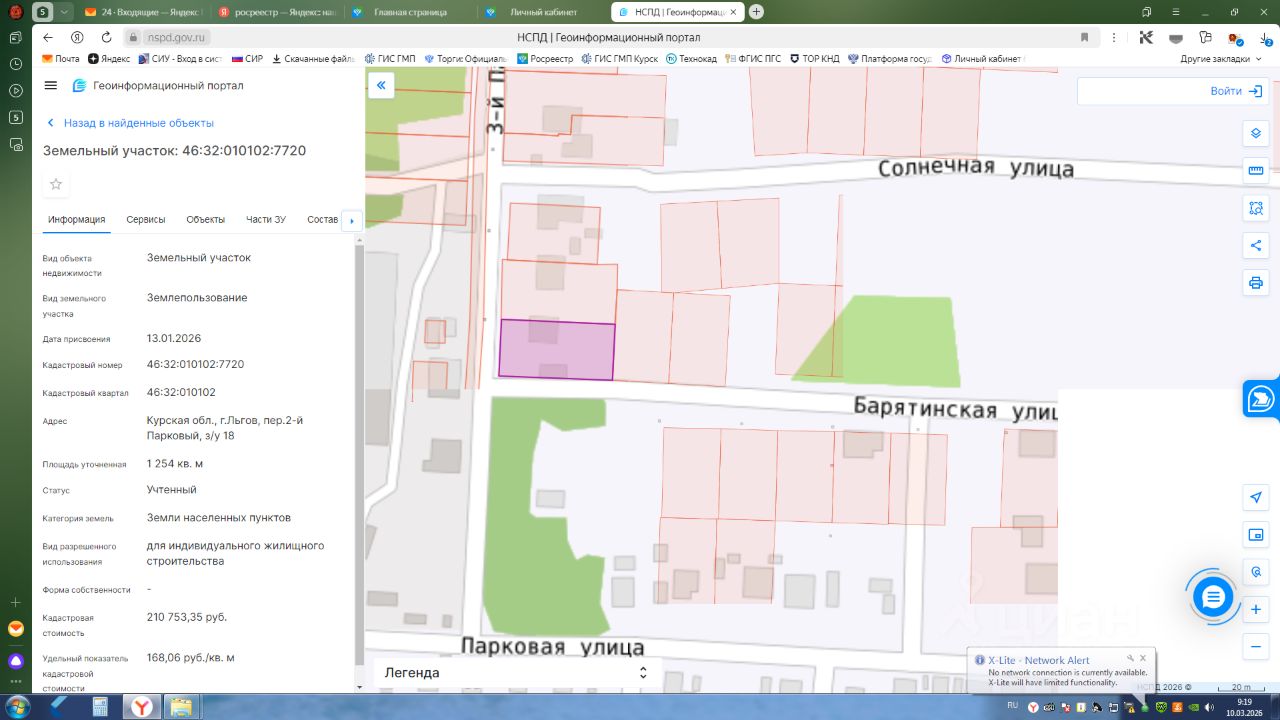 Адрес (описание местоположения): Курская область, г.Льгов, 2-й пер. Парковый, з/у 18 Кадастровый номер: 46:32:010102:7220 Кадастровая стоимость: 210753 руб. 35 коп. Общая площадь: 1254 кв.м. Категория земель: земли населенных пунктов. Разрешенное использование: Для индивидуального жилищного строительства.