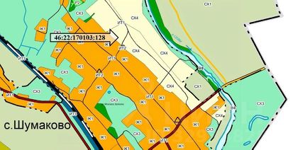 Земельный участок с кадастровым номером 46:22:170103:128, площадью 23786+/-54 кв.м., разрешенное использование растениеводство, расположенный по адресу: Российская Федерация, Курская область, м.р-н Солнцевский, с.п. Шумаковский сельсовет, с. Шумаково, граница земельного участка состоит из 2 контуров.