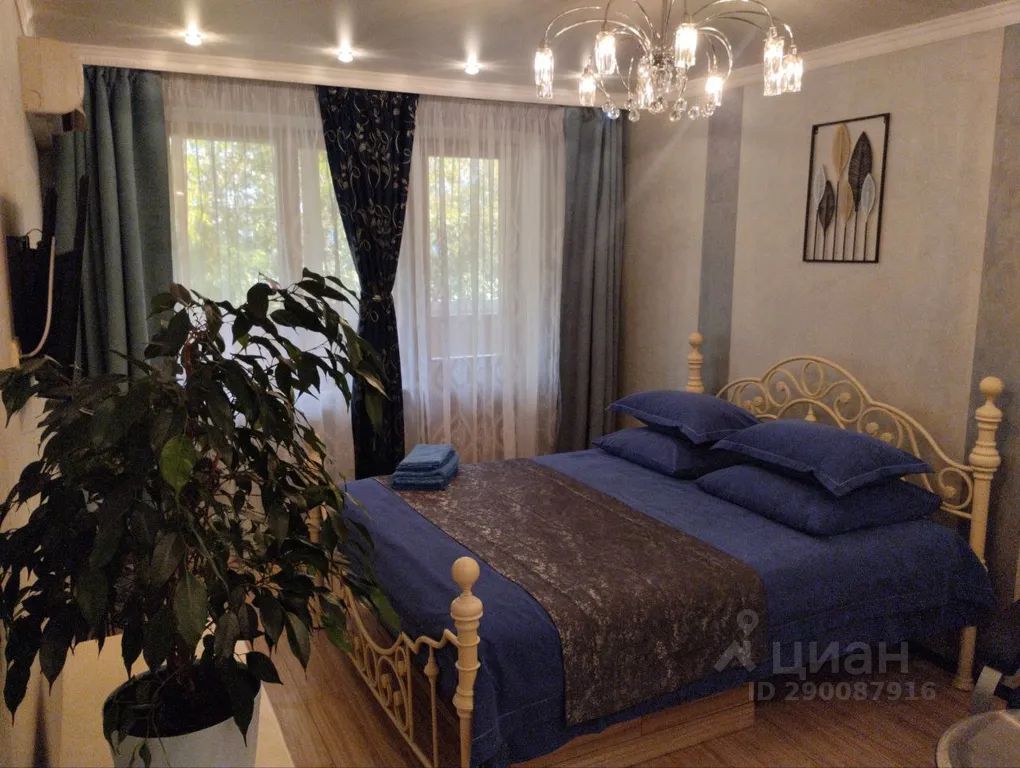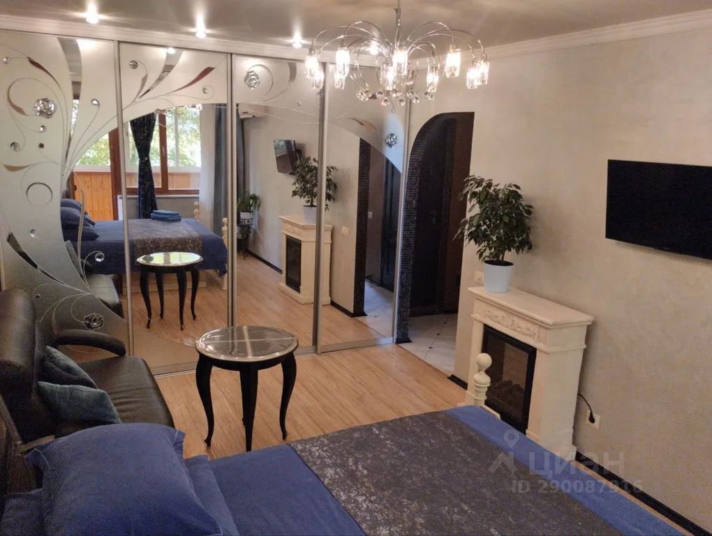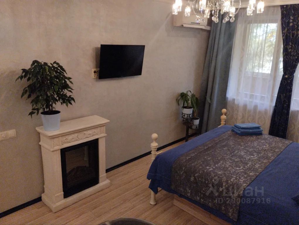 Апартаменты с дизайнерским дорогим и высококачественным ремонтом (сентябрь 2023г) с мебелью по индивидуальному заказу, с новой бытовой техникой. Это настоящий райский уголок для притязательных, ценящих качество и комфорт людей. Комната выполнена в серебристо- синих благородных тонах. Панорамный зеркальный шкаф инкрустирован стразами сваровски. Электрокамин и живые цветы подчёркивают атмосферу уюта. Здесь же выход на балкон. Остекление балкона раздвижное алюминиевое с тонированными стеклами.