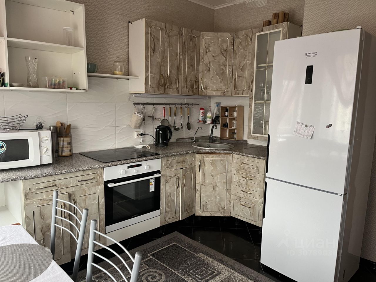 Техника: варочная панель, духовой шкаф, холодильник, микроволновая печь, электрочайник, телевизор, стиральная машина, пылесос, водонагреватель.