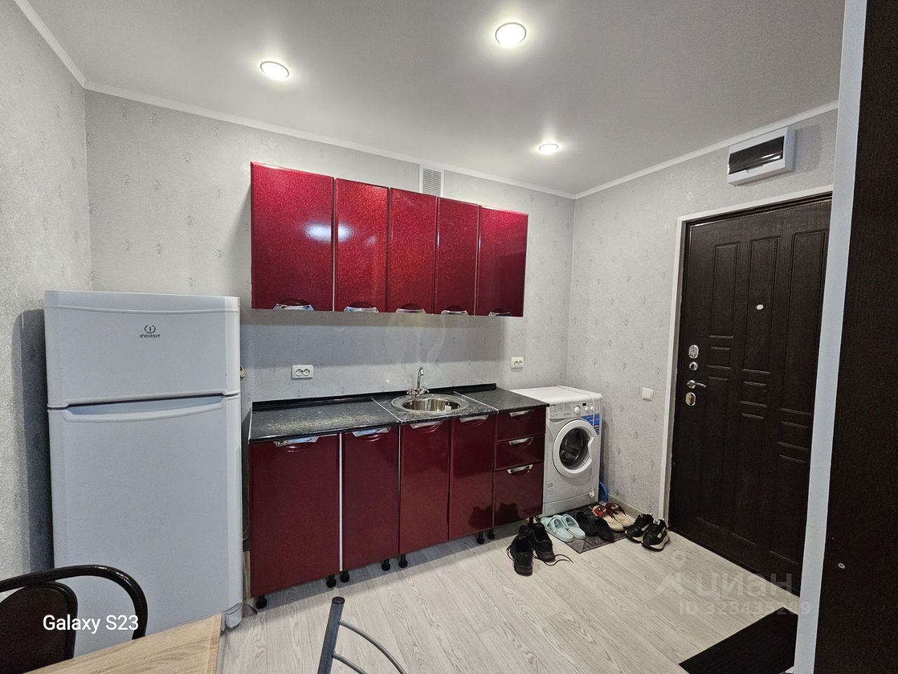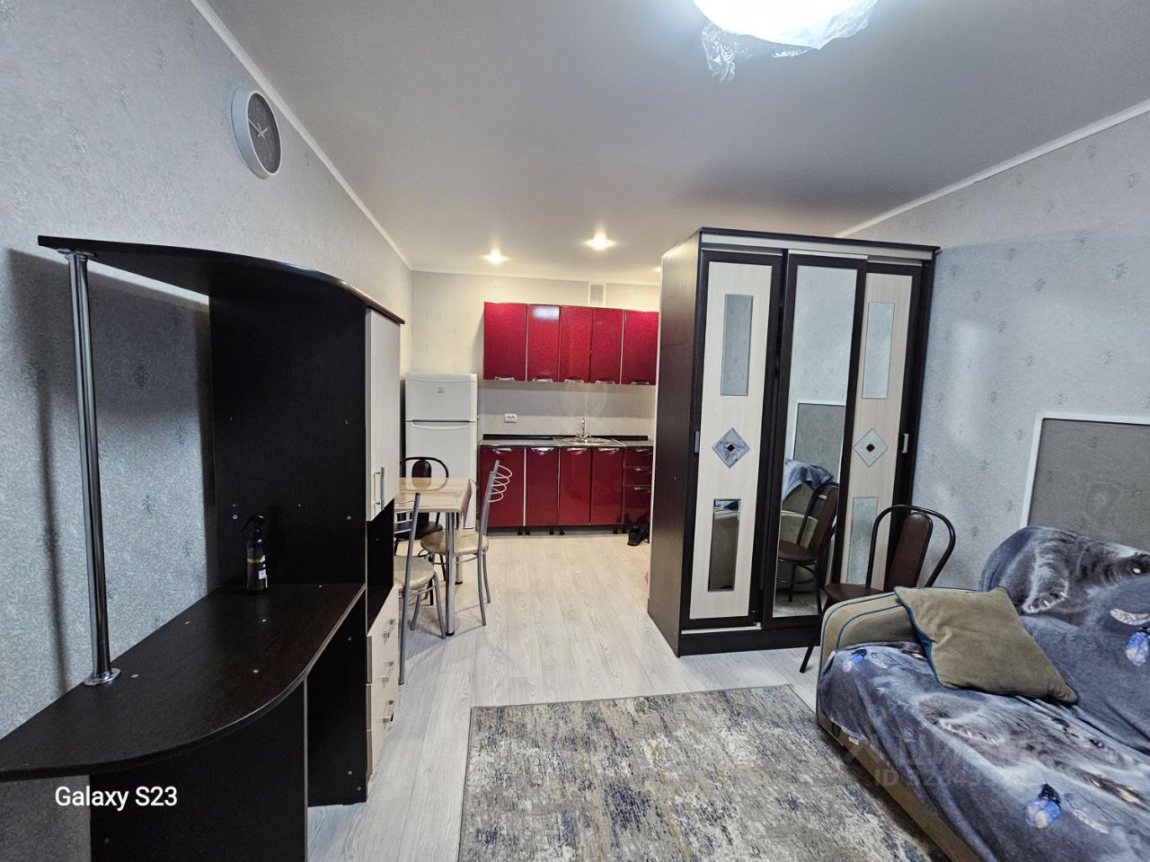 В комнате есть диван, холодильник, стиральная машинка, кухонный гарнитур, обеденный стол и стулья, шкаф.
