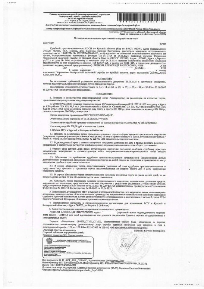 Нежилое помещение (гараж) площадью 49,7 кв. м, кадастровый номер 46:29:102218:1565 (имущество обременено: арест, запрет на совершение регистрационных действий). Взыскатель - УФНС России по Курской области. Имущество принадлежит на праве собственности должнику Ряшкину А.В. Основание проведения аукциона: постановление о передаче арестованного имущества на торги от 08.07.2025 98046/25/87819 судебного пристава - исполнителя СОСП по Курской области ГМУ ФССП России
