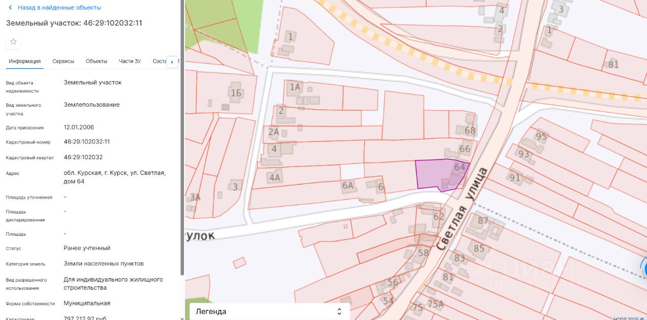 Предметом аукциона является право на заключение договора купли-продажи земельного участка с кадастровым номером 46:29:102032:11, площадью 872 кв.м, расположенного по адресу: г. Курск, ул. Светлая, дом 64 с видом разрешенного использования земельного участка "для индивидуального жилищного строительства", государственная собственность на который не разграничена.