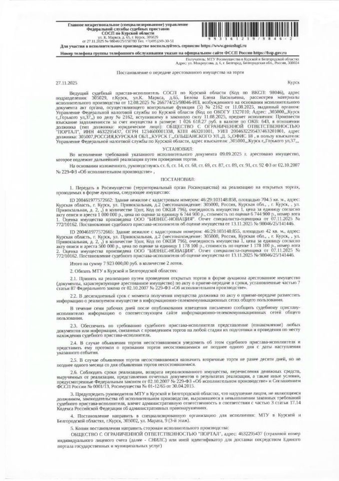 Здание нежилое, площадью 42 кв. м, кадастровый номер 46:29:103148:855 (имущество обременено: арест, запрет на совершение регистрационных действий). Согласно информации Министерства имущества Курской области, земельный участок под объектом недвижимости предоставлен должнику в аренду сроком с 10.03.2023 по 24.12.2029. Имущество принадлежит на праве собственности должнику ООО "Портал". Взыскатель УФНС России по Курской области. Основание проведения аукциона: постановление о передаче арестованного имущества на торги от 27.11.2025 98046/25/150780 судебного пристава - исполнителя СОСП по Курской области ГМУ ФССП России