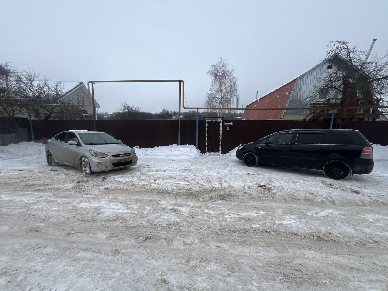 Над металическими воротами во двор газовая труба поднята прямоугольным способом для проезда объемной техники (это оформлено официально).