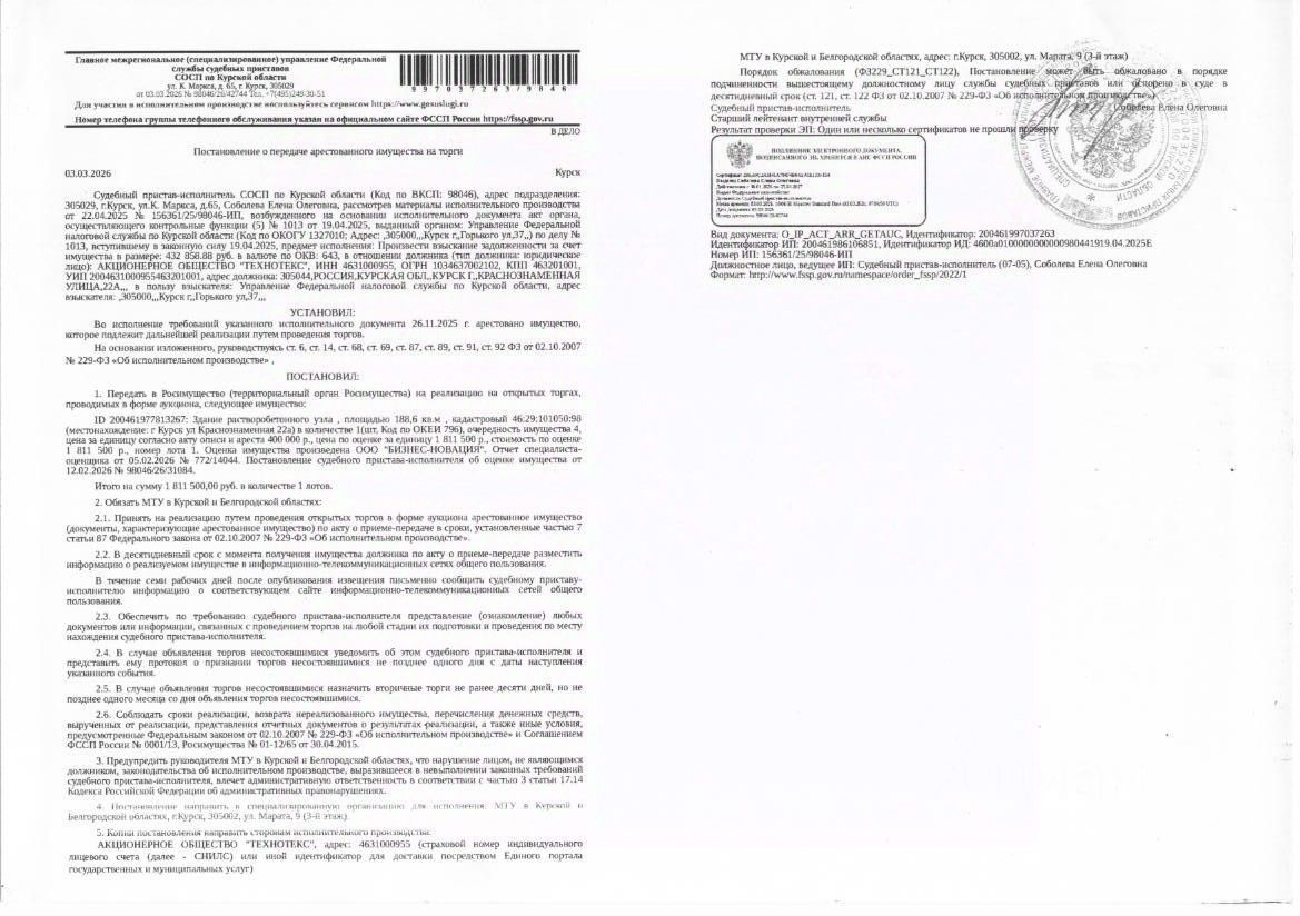 Здание растворобетонного узла (нежилое) площадью 188,6 кв. м, кадастровый номер 46:29:101050:98 (имущество обременено: арест, запрет на совершение регистрационных действий). Под объектом недвижимости земельный участок предоставлен в аренду. Взыскатель - УФНС России по Курской области. Имущество принадлежит на праве собственности должнику АО "Технотекс". Основание проведения аукциона: постановление о передаче арестованного имущества на торги от 03.03.2026 98046/26/42744 судебного пристава - исполнителя СОСП по Курской области ГМУ ФССП России