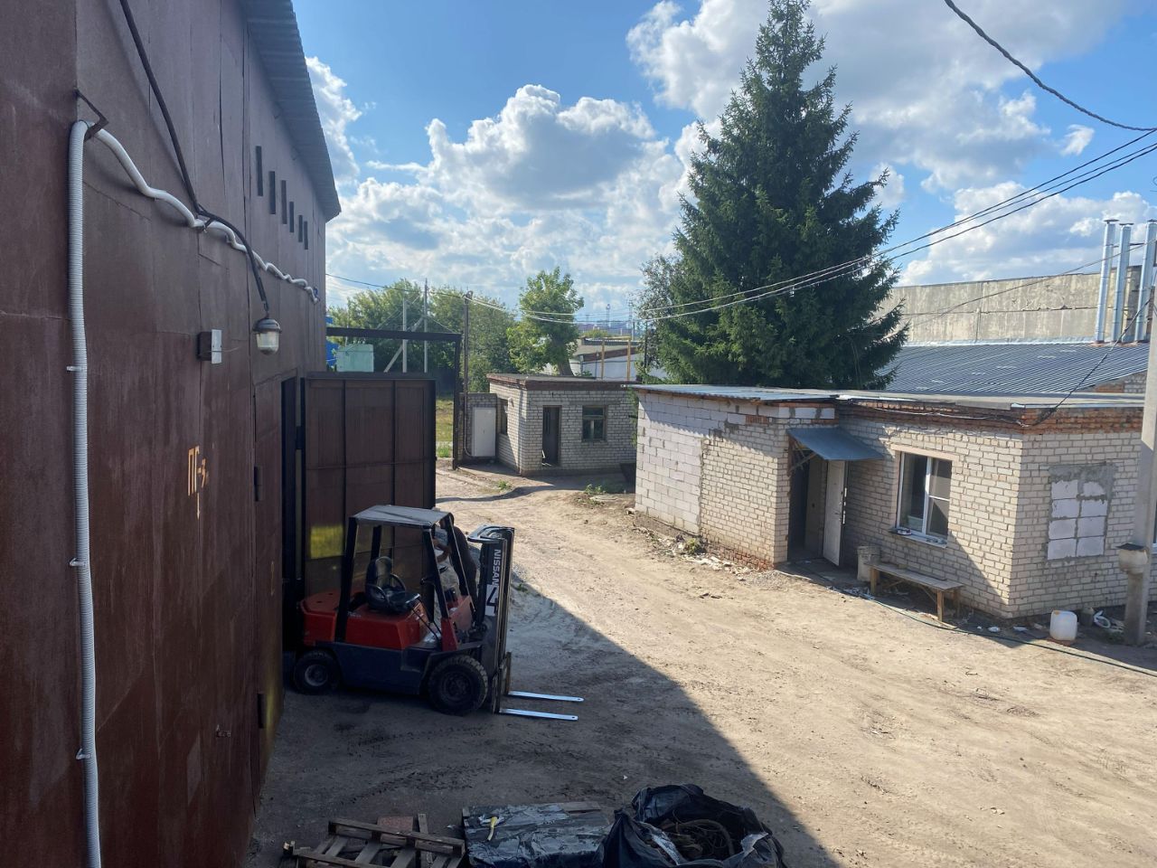 Есть площадка под навес. Вдоль железобетонного склада по кадастру лежат рельсы (по факту только шпалы) при желании можно восстановить. По базе лежит асфальтовое мощение (на троечку). Территория огорожена забором, один въезд. Электричество 100 кВт, но воздушка рядом, при желании можно ставить свой трансформатор. Газ рядом с участком.