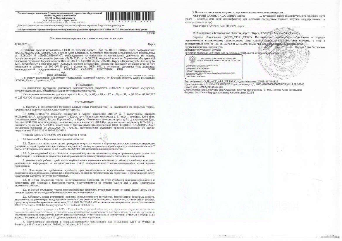 Нежилое помещение в здании общежития литер А площадью 120,6 кв. м, кадастровый номер 46:29:103133:417 (имущество обременено: арест, запрет на совершение регистрационных действий). Имущество принадлежит на праве собственности должнику Мкртчян С.А. Взыскатель УФНС России по Курской области. Основание проведения аукциона: постановление о передаче арестованного имущества на торги от12.03.2026 98046/26/47638 судебного пристава СОСП по Курской области ГМУ ФССП России