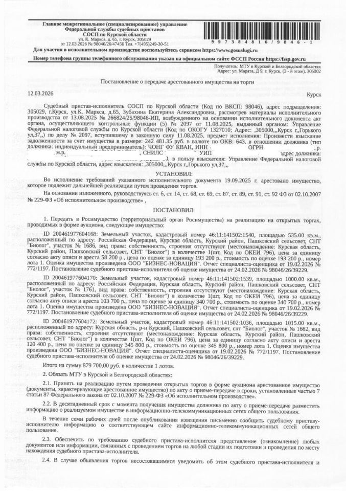 Земельный участок площадью 1000 кв. м, кадастровый номер 46:11:141502:1539, категория земель: земли сельскохозяйственного назначения, вид разрешенного использования: ведение садоводства (имущество обременено: арест; запрет на совершение регистрационных действий; ограничения прав на земельный участок, предусмотренные статьей 56 Земельного кодекса Российской Федерации). Имущество принадлежит на праве собственности должнику Чонг Фу Кван. Взыскатель - УФНС России по Курской области. Основание проведения аукциона: постановление о передаче арестованного имущества на торги от 12.03.2026 98046/26/47456 судебного пристава - исполнителя СОСП по Курской области ГМУ ФССП России; решение Ленинского районного суда г. Курска от 04.12.2025 2-6245/11-2025; определение Ленинского районного суда г. Курска от 12.01.2026
