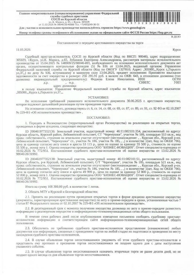 Земельный участок площадью 521 кв. м, кадастровый номер 46:11:082101:51, категория земель: земли сельскохозяйственного назначения, вид разрешенного использования: для ведения садоводства и огородничества (имущество обременено: арест; запрет на совершение регистрационных действий; ограничения прав на земельный участок, предусмотренные статьей 56 Земельного кодекса Российской Федерации). Имущество принадлежит на праве собственности должнику Федяевой Е.Н. Взыскатель - УФНС России по Курской области. Основание проведения аукциона: постановление о передаче арестованного имущества на торги от 11.03.2026 98046/26/46666 судебного пристава - исполнителя СОСП по Курской области ГМУ ФССП России; решение Арбитражного суда Курской области от 25.12.2025 А35-5446/2025