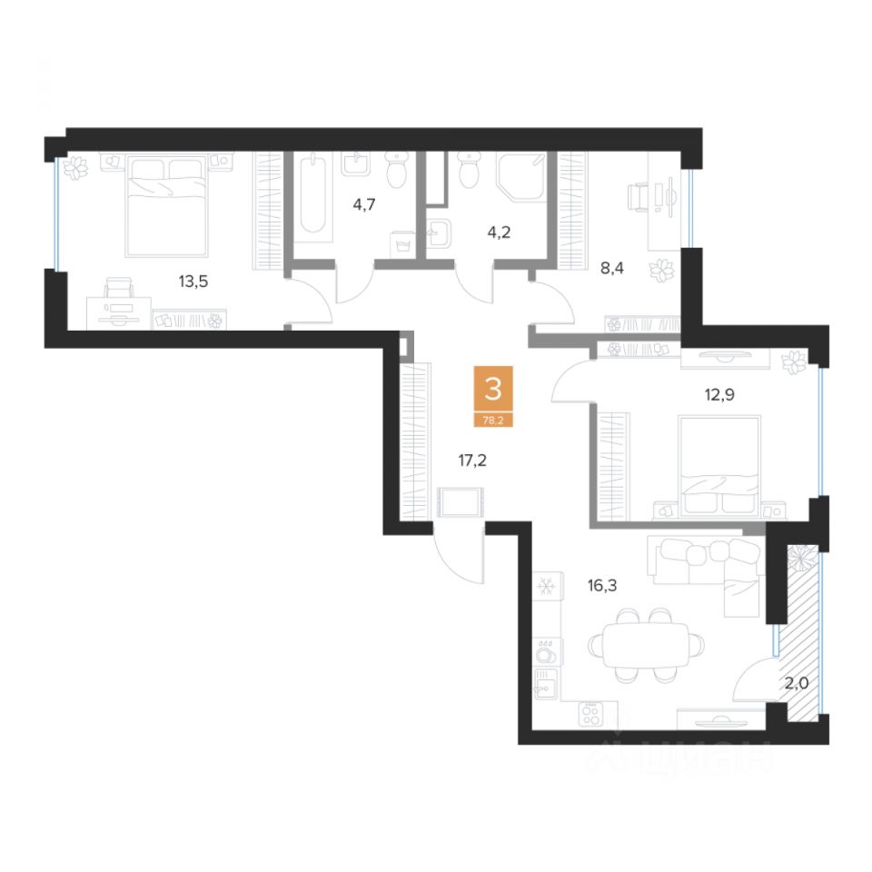 Вашему вниманию представлен один из возможных вариантов планировочных решений - трехкомнатная квартира Евро формата (4Е), находящуюся в жилом доме Комплекса Парковый Квартал "Чувства".