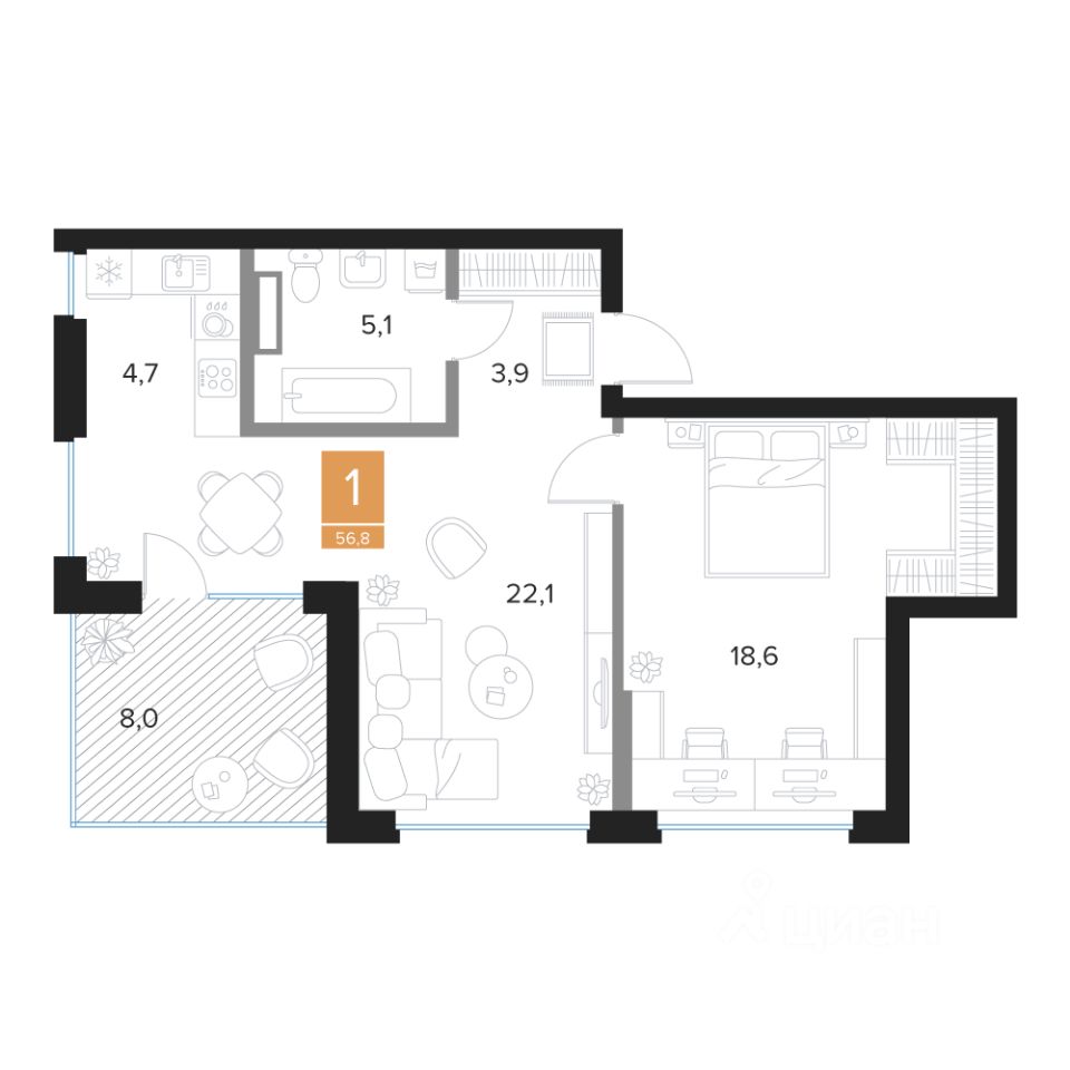 Общая площадь56,8 м²