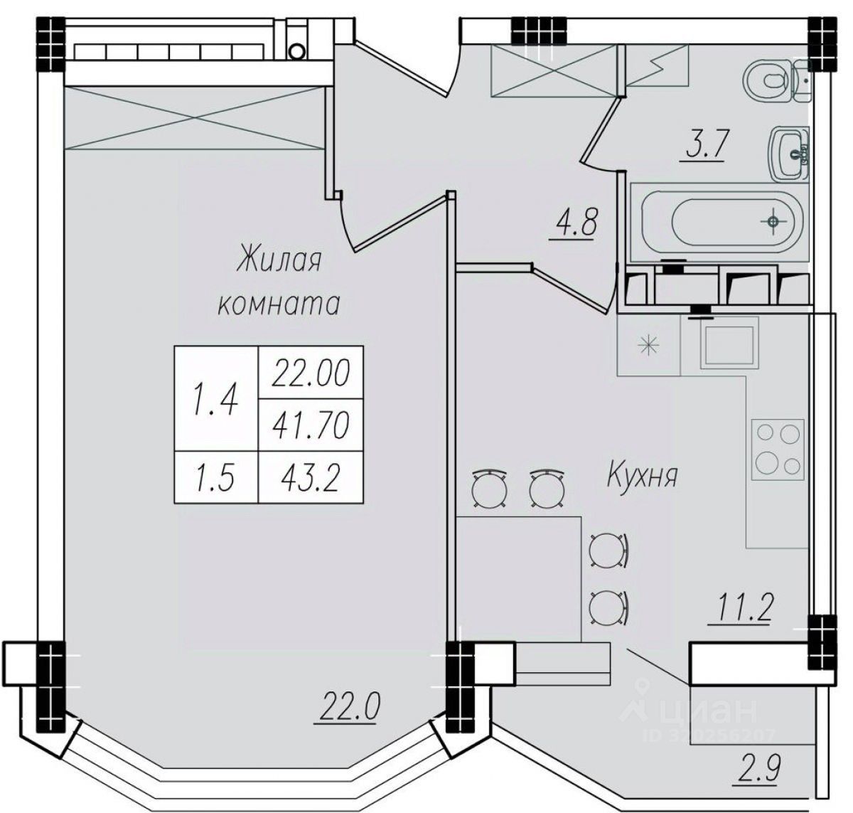 Вашему вниманию представлен один из возможных вариантов планировочных решений 1-х комнатной квартиры - классическая однокомнатная квартира. Отличительной особенностью данной квартиры является - эркерное остекление жилой комнаты и наличие в ней ниши для гардеробной.