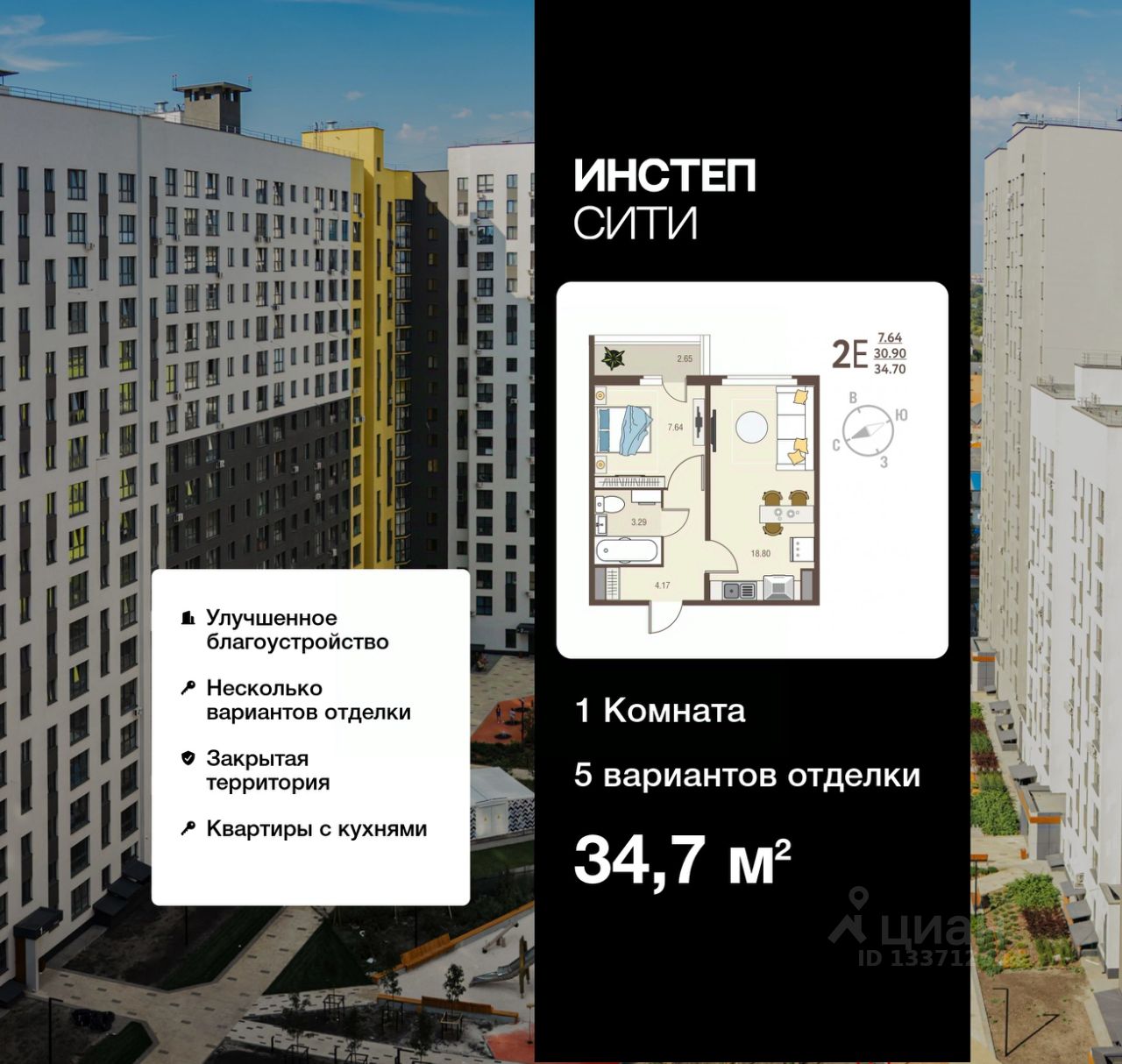 Продается однокомнатная квартира от застройщика с предчистовой отделкой в ЖК "Инстеп.Сити" на 1 этаже. Общая площадь: 34.7 кв.м., жилая: 7.64 кв.м., площадь просторной кухни-столовой: 18.8 кв.м. Все окна выходят на одну сторону. В квартире один балкон, один совмещенный санузел. Высота потолков 2.64 м.