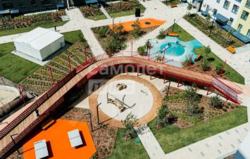 Территория ЖК включает большое количество элементов, напоминающих детали и запчасти различных механизмов. Озеленение, уникальное оборудование, беседки и малые архитектурные формы - все подчеркивает идентичность места