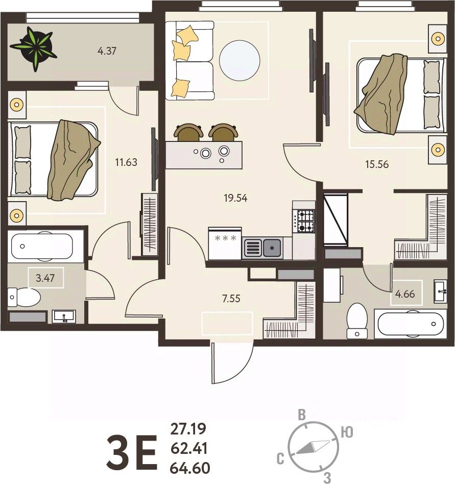 Продается 2-комн. квартира с предчистовой отделкой в ЖК "Инстеп.Сити" на 6 этаже. Общая площадь: 64.6 кв.м. Высота потолков 2.64 м.