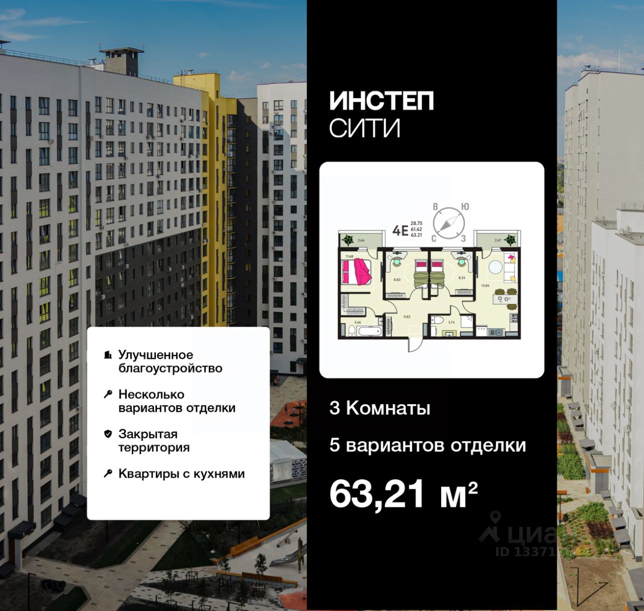 3-комн. квартира от застройщика с предчистовой отделкой в ЖК "Инстеп.Сити" на 1 этаже. Общая площадь: 63.21 кв.м., жилая: 28.75 кв.м., площадь просторной кухни-столовой: 15.84 кв.м. Комнаты изолированные, все окна выходят на одну сторону. В квартире два балкона, два совмещенных санузла. Высота потолков 2.64 м.