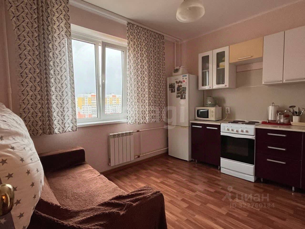 В квартире остается практически вся мебель (диван в жилой комнате и на кухне, шкаф-купе, кухонный гарнитур, полка в комнате) и техника (холодильник).