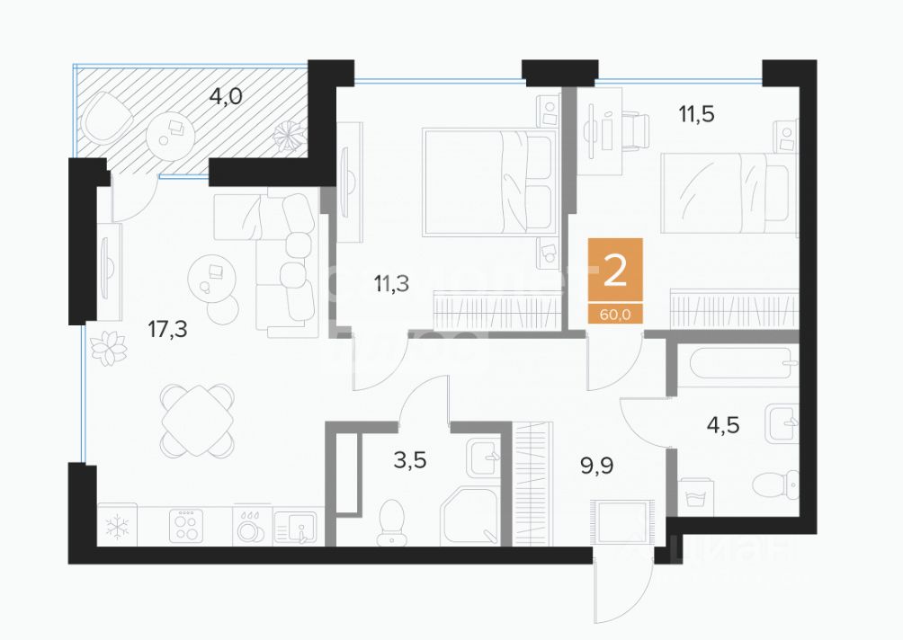 Арт. 124137924 2 к.кв 60.00 м2 в новом жилом комплексе, расположенном в одном из самых современных и экологически чистых районов Курска.