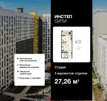 1-комн. квартира-студия с предчистовой отделкой в ЖК "Инстеп.Сити" на 11 этаже. Общая площадь: 27.26 кв.м., площадь гостиной 19.54 кв.м., из которых 5.58 кв.м. выделено под кухонную зону. Все окна выходят на одну сторону. В квартире один балкон, один совмещенный санузел. Высота потолков 2.64 м.