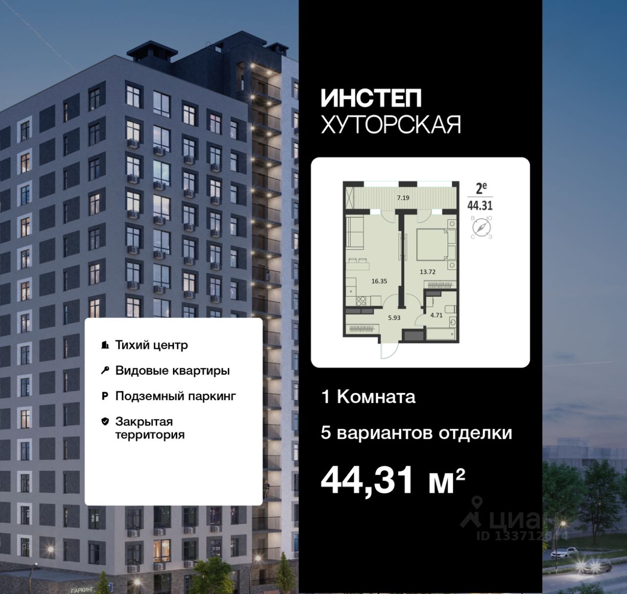 Просторная 1-комн. квартира в ЖК "ИНСТЕП.ХУТОРСКАЯ" на 10 этаже. Квартира без отделки, после получения ключей можно делать ремонт. Общая площадь: 44.31 кв.м., жилая: 13.72 кв.м., площадь просторной кухни-столовой: 16.35 кв.м. Все окна выходят на одну сторону. В квартире один балкон, один совмещенный санузел. Терраса представляет собой роскошную зону отдыха, где вы на свой вкус можете создать атмосферу комфорта и уюта. Высота потолков 2.76 м.