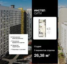 1-комн. квартира-студия от застройщика с предчистовой отделкой в ЖК "ИНСТЕП.СИТИ" на 3 этаже. Общая площадь: 26.38 кв.м., площадь гостиной 18.96 кв.м., из которых 5 кв.м. выделено под кухонную зону. Все окна выходят на одну сторону. В квартире один балкон, один совмещенный санузел. Высота потолков 2.64 м.