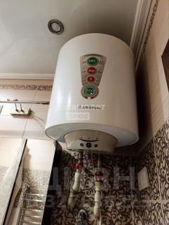 Санузел отделан современным кафелем, установлен водонагреватель и стиральная машина.