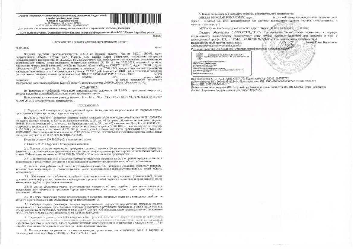 Жилое помещение (квартира) площадью 35,7 кв. м, кадастровый номер 46:29:103098:258 (имущество обременено: арест, запрет на совершение регистрационных действий). Имеется ограничение в виде ипотеки в силу закона в пользу АКБ "Банка Москвы" (Банк ВТБ (ПАО) - задолженность по процентам, пеням и др.). Информация о зарегистрированных лицах и о задолженности по взносам на капитальный ремонт судебным приставом - исполнителем организатору торгов не представлена. Имущество принадлежит на праве собственности должнику Зикееву Н.Р. Взыскатель УФНС России по Курской области. Основание проведения аукциона: постановление о передаче арестованного имущества на торги от 26.02.2026 98046/26/40125 судебного пристава - исполнителя СОСП по Курской области ГМУ ФССП России