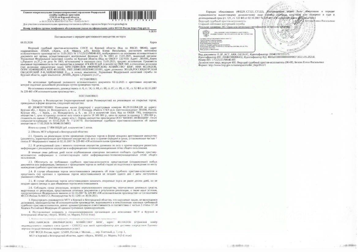 Жилое помещение (квартира) площадью 174,9 кв. м, кадастровый номер 46:29:102264:228 (имущество обременено: арест, запрет на совершение регистрационных действий). Информация о зарегистрированных лицах и о задолженности по взносам на капитальный ремонт судебным приставом - исполнителем организатору торгов не представлена. Имущество принадлежит на праве собственности должнику Крестьянское (фермерское) хозяйство "Бия". Взыскатель УФНС России по Курской области. Основание проведения аукциона: постановление о передаче арестованного имущества на торги от 06.03.2026 98046/26/45102 судебного пристава - исполнителя СОСП по Курской области ГМУ ФССП России