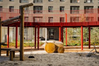 Во дворе представлено фирменное благоустройство от ИНСТЕПА, которое уже можно увидеть в сданных домах первой очереди большие игровые комплексы из натурального дерева в эко-стиле, высокие горки, пешеходные мосты, батуты и спортивные тренажеры с изменяемой нагрузкой. Продуманное озеленение по дендроплану с автополивом липы, клены, много хвойных деревьев, большие зоны с кустарниками (спиреи, можжевельники, пузыреплодники и другие тщательно подобранные растения). Во дворе предусмотрено наружное освещение на разных уровнях и гирлянды для вечерней подсветки.