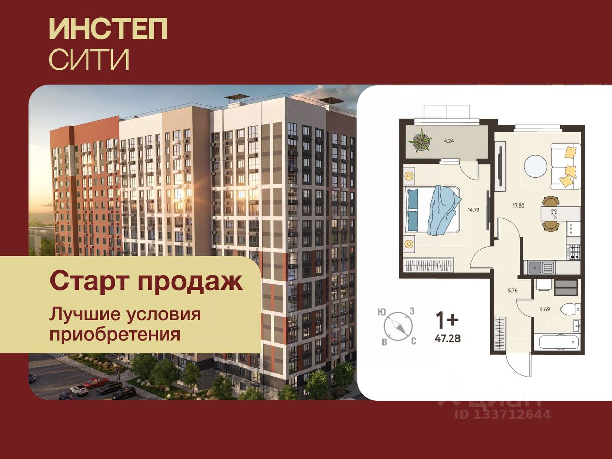 Продается однокомнатная квартира с предчистовой отделкой в ЖК "ИНСТЕП.СИТИ" на 16 этаже. Общая площадь: 45.16 кв.м., жилая: 14.79 кв.м., площадь просторной кухни-столовой: 17.8 кв.м. Все окна выходят на одну сторону. В квартире одна лоджия, один совмещенный санузел. Высота потолков 2.64 м.