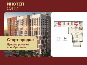 Трехкомнатная квартира от застройщика с предчистовой отделкой в ЖК "ИНСТЕП.СИТИ" на 6 этаже. Общая площадь: 91.6 кв.м., жилая: 41.16 кв.м., площадь просторной кухни-столовой: 18.3 кв.м. Квартира - распашонка, без проходных комнат, окна выходят на paзные стороны дома. В квартире одна лоджия, один раздельный санузел. Высота потолков 2.64 м.