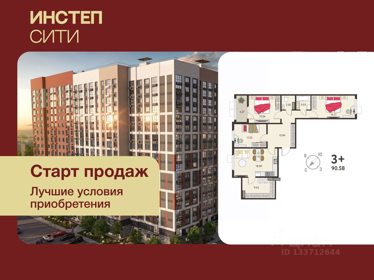 Продается 3-комн. квартира от застройщика с предчистовой отделкой в ЖК "ИНСТЕП.СИТИ" на 6 этаже. Общая площадь: 88.45 кв.м., жилая: 39.06 кв.м., площадь просторной кухни-столовой: 18.3 кв.м. Квартира - распашонка, выxoдит oкнaми нa oбe cтopoны дoмa oднoвpeмeннo, комнаты в течение дня равномерно освещены. В квартире одна лоджия, один раздельный санузел. Высота потолков 2.64 м.