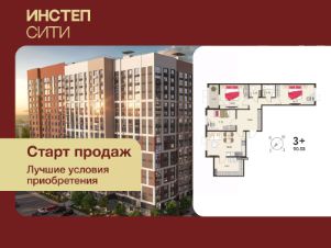 Просторная 3-комн. квартира с предчистовой отделкой в ЖК "ИНСТЕП.СИТИ" на 18 этаже. Общая площадь: 88.45 кв.м., жилая: 39.06 кв.м., площадь просторной кухни-столовой: 18.3 кв.м. Квартира - распашонка, без проходных комнат, окна выходят на paзные стороны дома. В квартире одна лоджия, один раздельный санузел. Высота потолков 2.64 м.