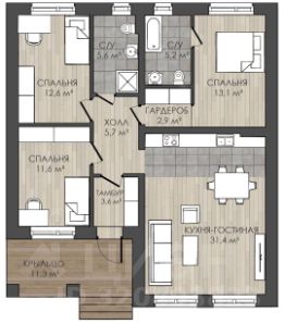 2 сан узла, 2 изолированные спальни, и еще 1 мастер спальня со своим сан узлом и небольшой гардеробной.