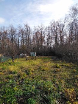 Участок 4,5 сотки у лесополосы в тихом и зелёном месте. На участке растёт десяток садовых деревьев. Есть хозпостройка. Участок фактически больше. Последние годы участок только косился.