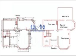 1 этаж- холл, кухня, гостинная, санузел,