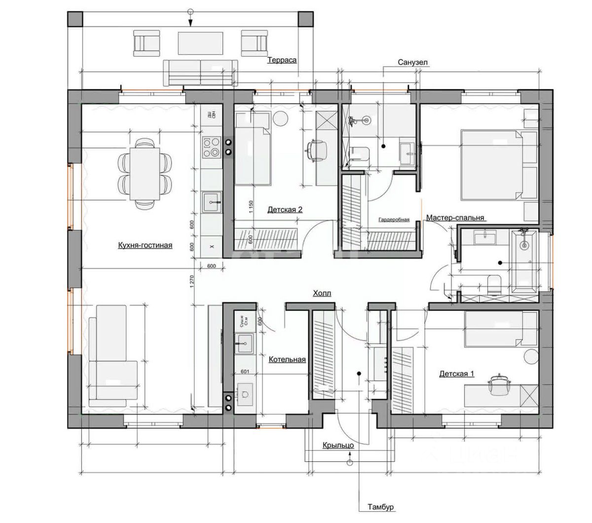 В доме три спальни (одна из них мастер-спальня), ванная комната, просторная кухня-гостиная.