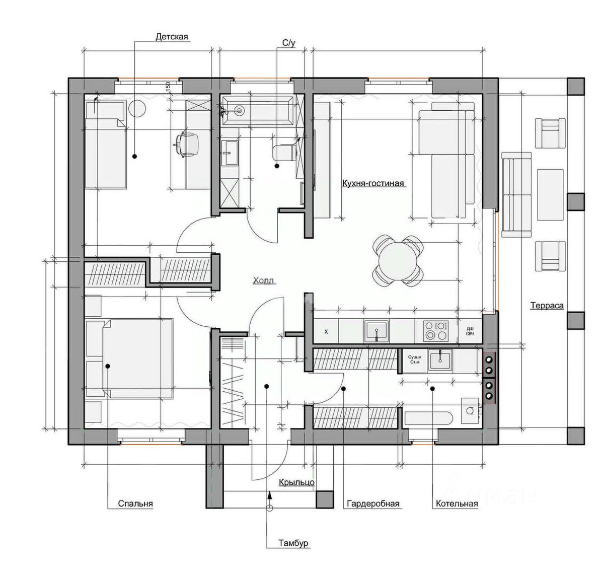 В доме две спальни, ванная комната, совмещённый санузел, просторная кухня-гостиная.